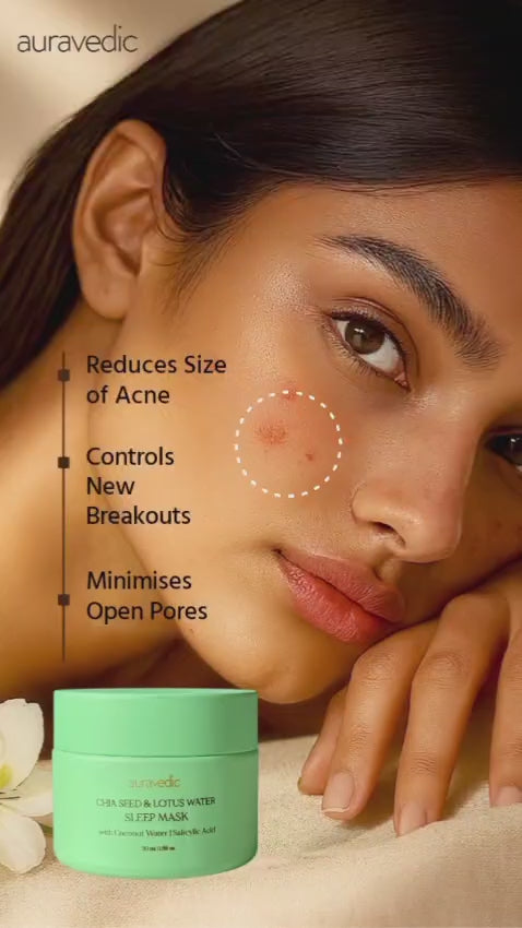 AURAVEDIC CHIA SEED & COCONUT WATER SLEEP MASK with RICE EXTRACT: Wake up to smoother clearer skin with our ultra light sleep mask. This is an acne controlling sleep mask that helps reduce breakouts, blemishes and open pores.