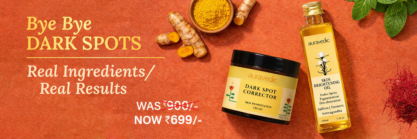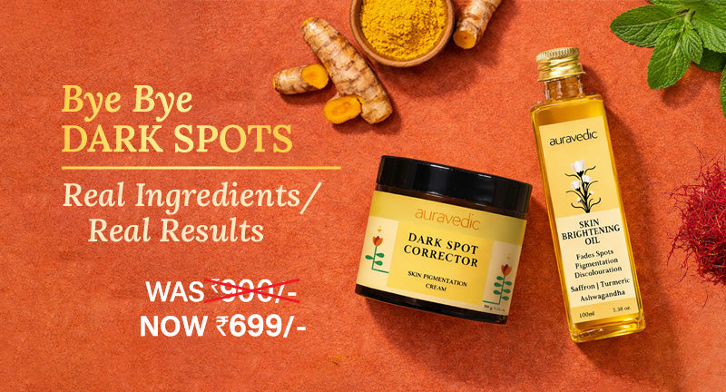 Skin Brightening Oil by penetrating its natural constituents deep down into the skin lightens the brown patches. Dark Spot Corrector Cream reduces acne and spots to provide an even tone to the skin.